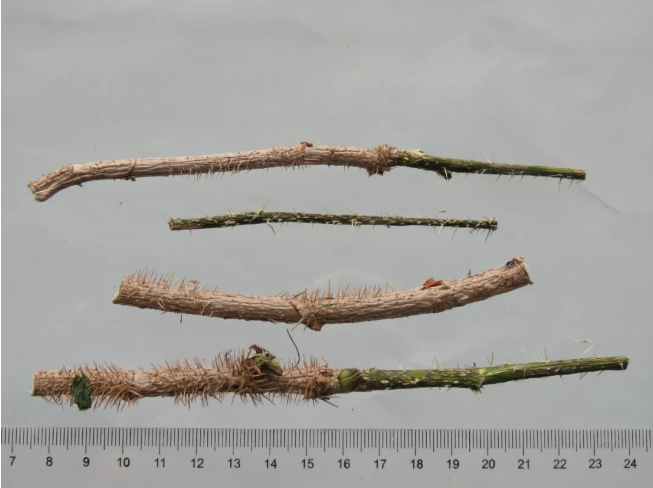 本品茎呈长圆柱形,,多分枝,,,长短不一,,,,直径0.5~2cm。。。表面浅灰色,,老枝灰褐色,,,,具纵裂沟,,,无刺;幼枝黄褐色,,密生细刺。。质坚硬,,,不易折断,,,,断面皮部薄,,,,黄白色,,,,木部宽广,,,淡黄色,,,,中心有髓。。。。气微,,,味微辛。。。